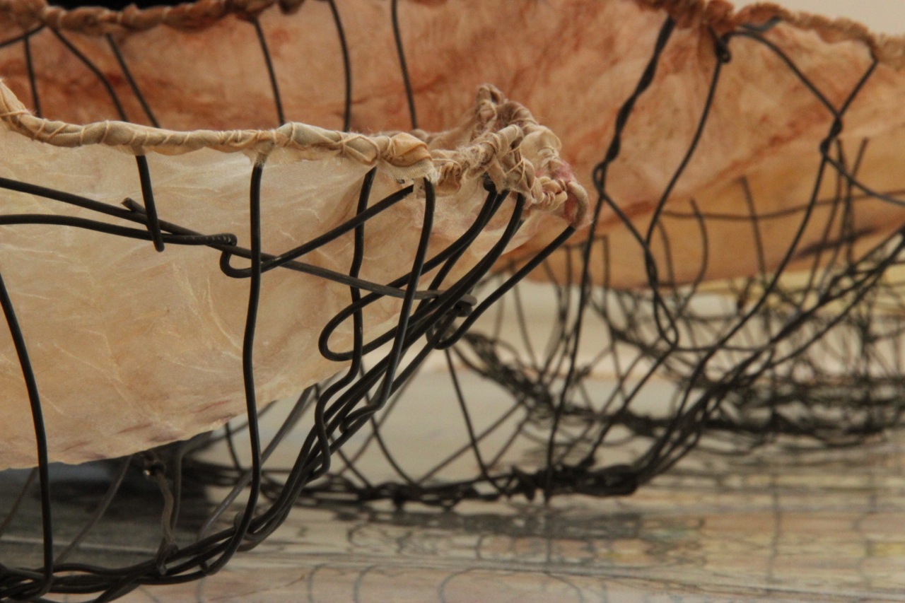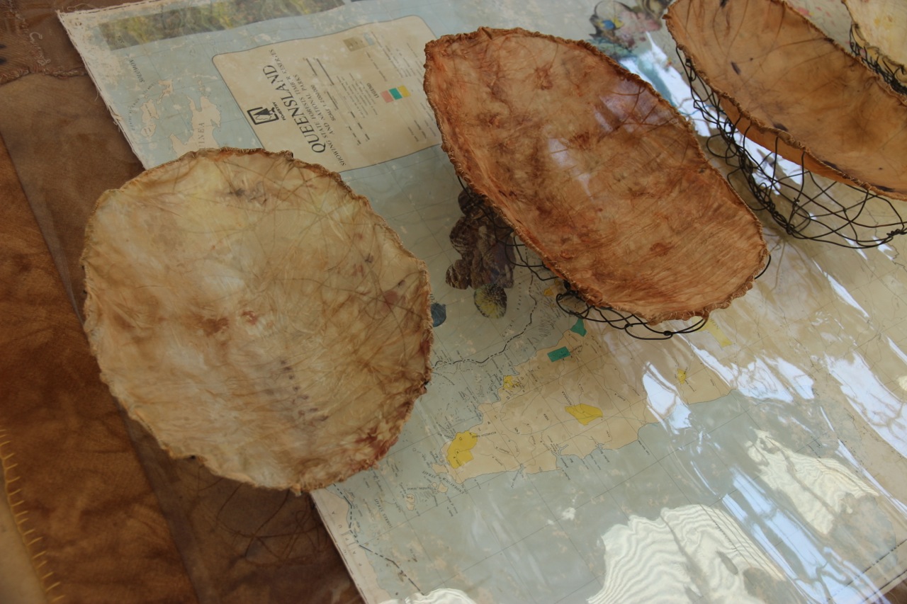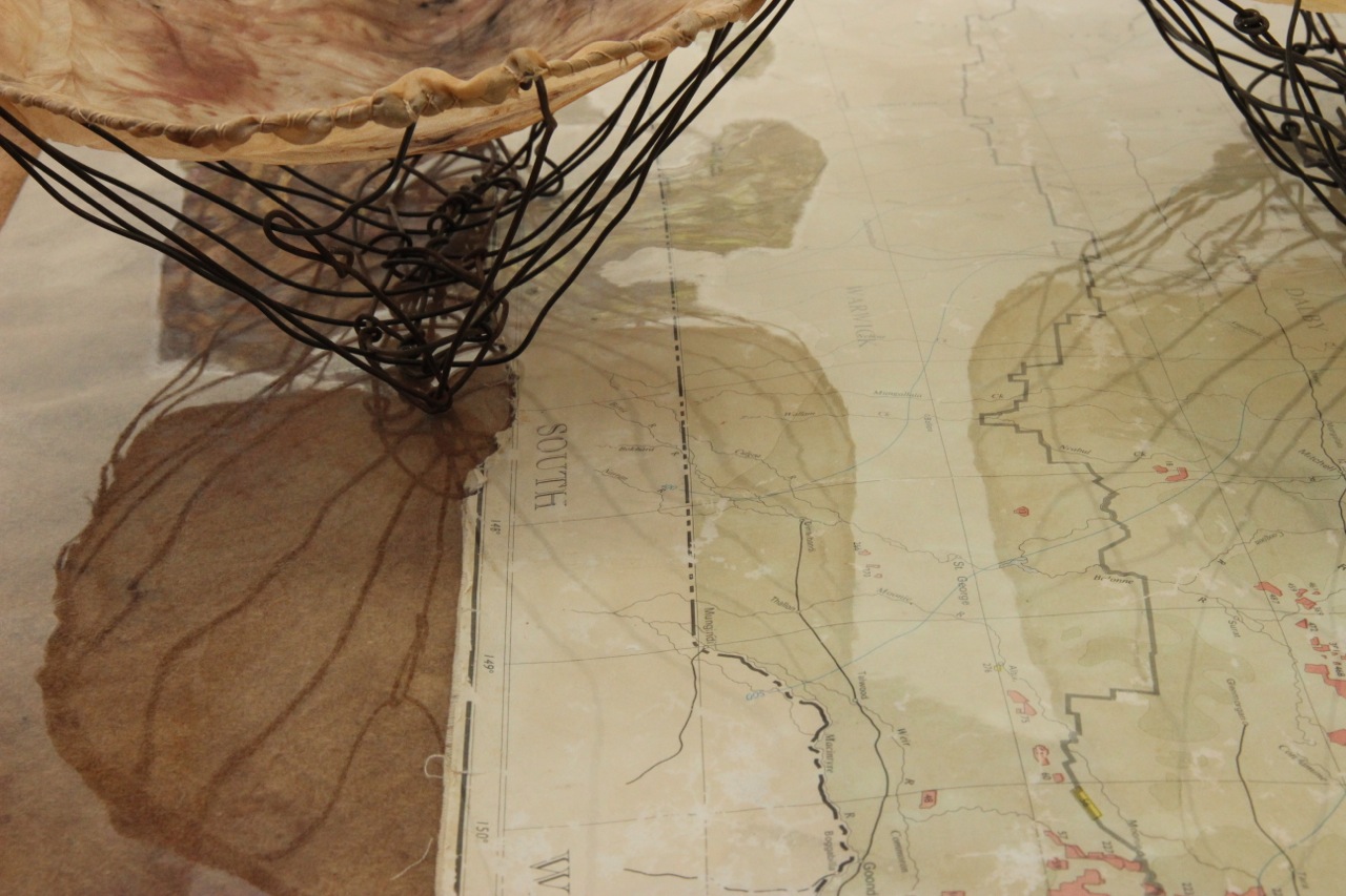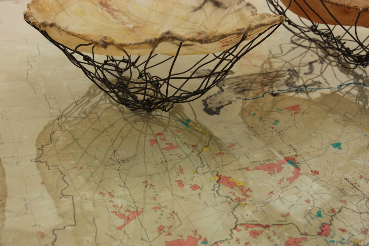 In Vanishing Food Bowls silk bowls imprinted with plants from the Bimblebox Nature Refuge are suspended into the top of wire forms that I think of as ‘ghost coolamons’.
