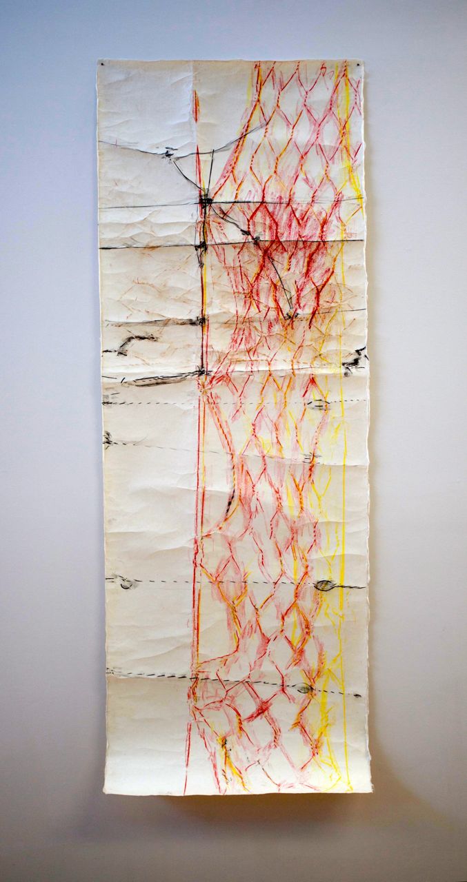 Imprinting Boundaries and Netting Fences (2012), Crayon, sand and wax on Kozo paper. 182 x 66cm (Image: 1.) Photo by Mel de Ruyter