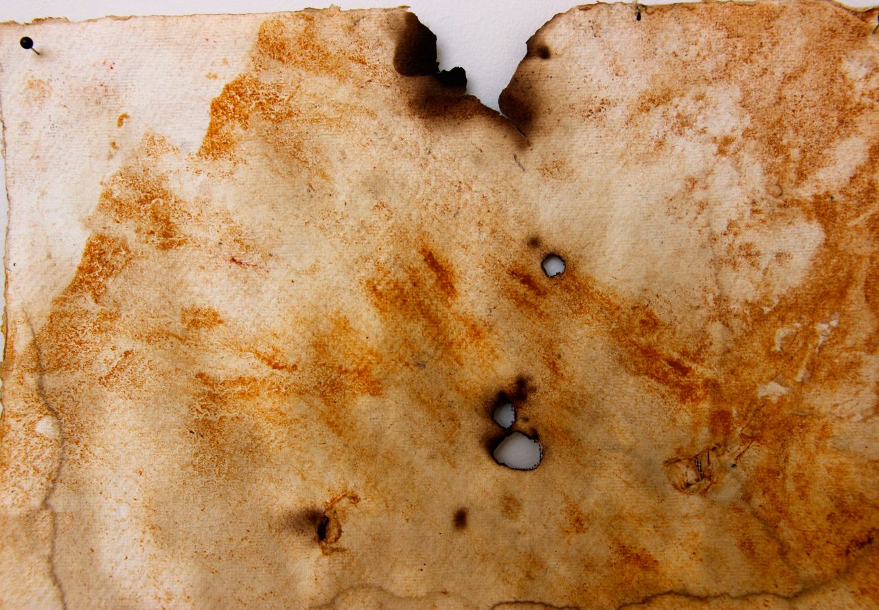 Laying paper over burnings with smoke, ash and coals is another way for Jude to capture the elements of transformation.