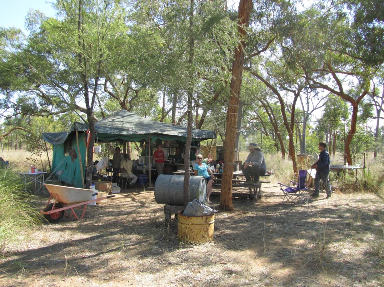 The camp site – left to right – Paola Cassoni, Emma Harm, Glenda Orr, Felicity Davis, Greg Harm, Karl Hoch