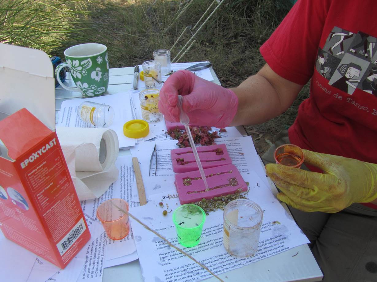 Glenda Orr casting gathered material (seeds, flowers, leaves) in resin