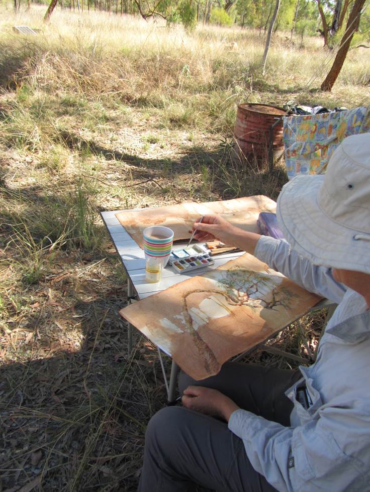 This year’s artist camp was another remarkable immersive experience. The quiet open forest in this remote area invites deep breathing, reflective conversation, busy creative work, a tangible and intimate sense of connection with people, place and environment. One senses the keen eyes of the local inhabitants, birds and kangaroos, monitoring our stay, expressing their curiosity at a safe distance of their choosing. The spring time is such a turn-on with so many flowers, butterflies, beetles and birds. I’ve now seen and experienced more of the property and feel deeply enriched by the all-too-brief encounters but know that I have barely scratched the surface of this special place. Here are some photos from last week’s camp which hopefully give a hint of the delightful happenings – apologies to Pat Hoffie and Carol Schwarzman as I now realise I failed to take any good photos of their works. Too busy horsing around with Ian no doubt.