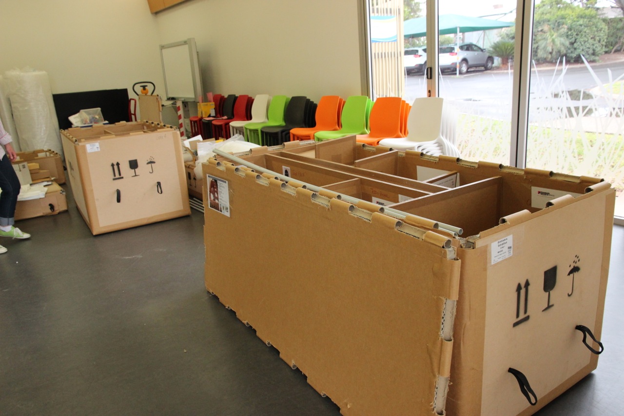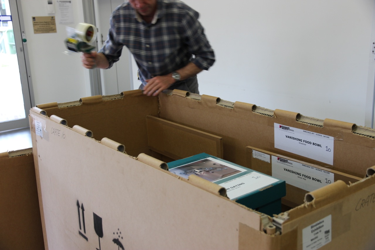 Over the past two days Bimblebox: art – science – nature has been getting ready to travel to Western Australia. The crates are amazing pieces of engineered packaging. Lightweight and ingenious, made out of cardboard. A very special thank you to Donna Davis who in her role with Museum and Gallery Services Qld, is managing the tour of this exhibition. Donna now knows these crates inside out and it was inspirational and educational working with her throughout Monday. Here are some pics: