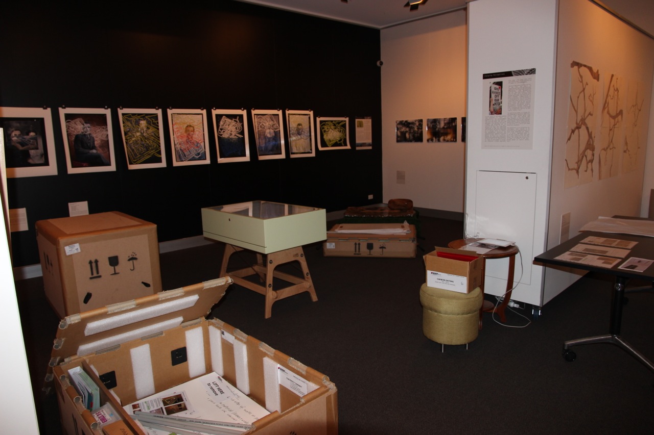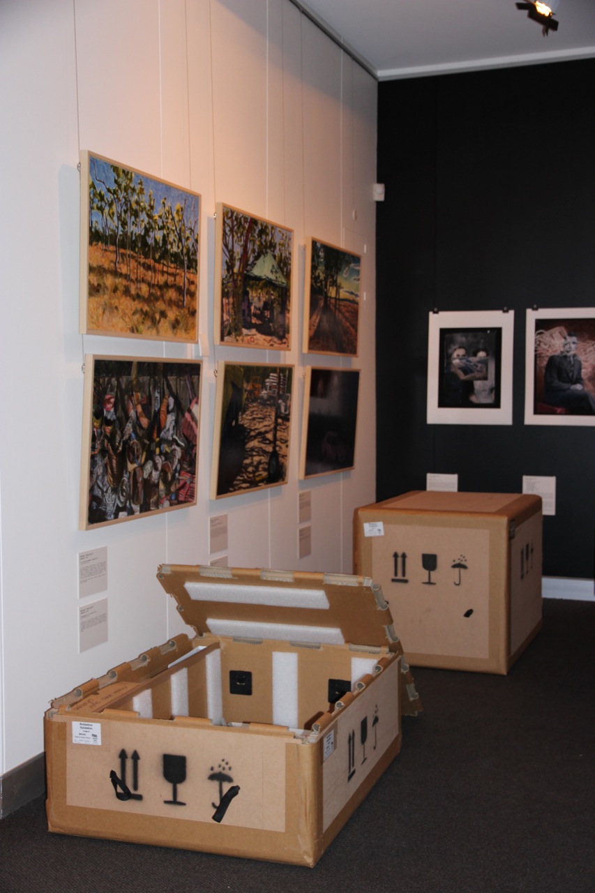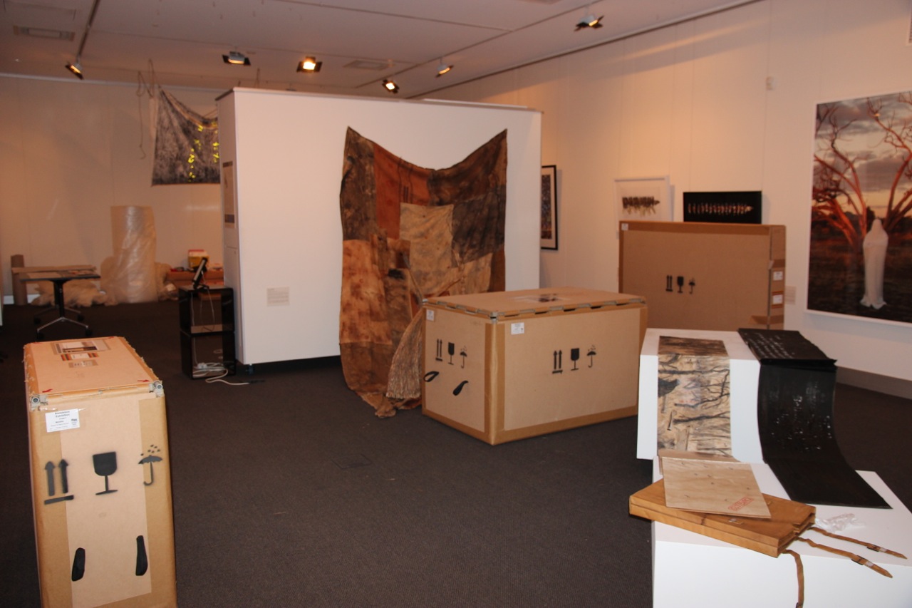 Little boxes in the gallery, but not all the same. Michael Pospischil’s and Fiona MacDonald’s artwork above the crates.