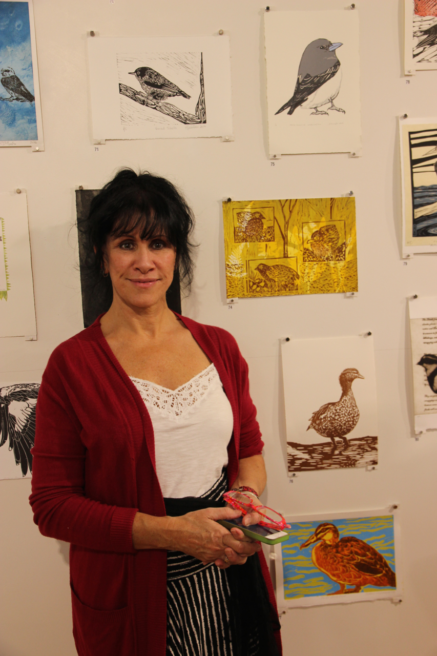 Artist Karen Kaese talks about her Dusky Woodswallow artwork (to Karen’s right), photo Jo Bragg
