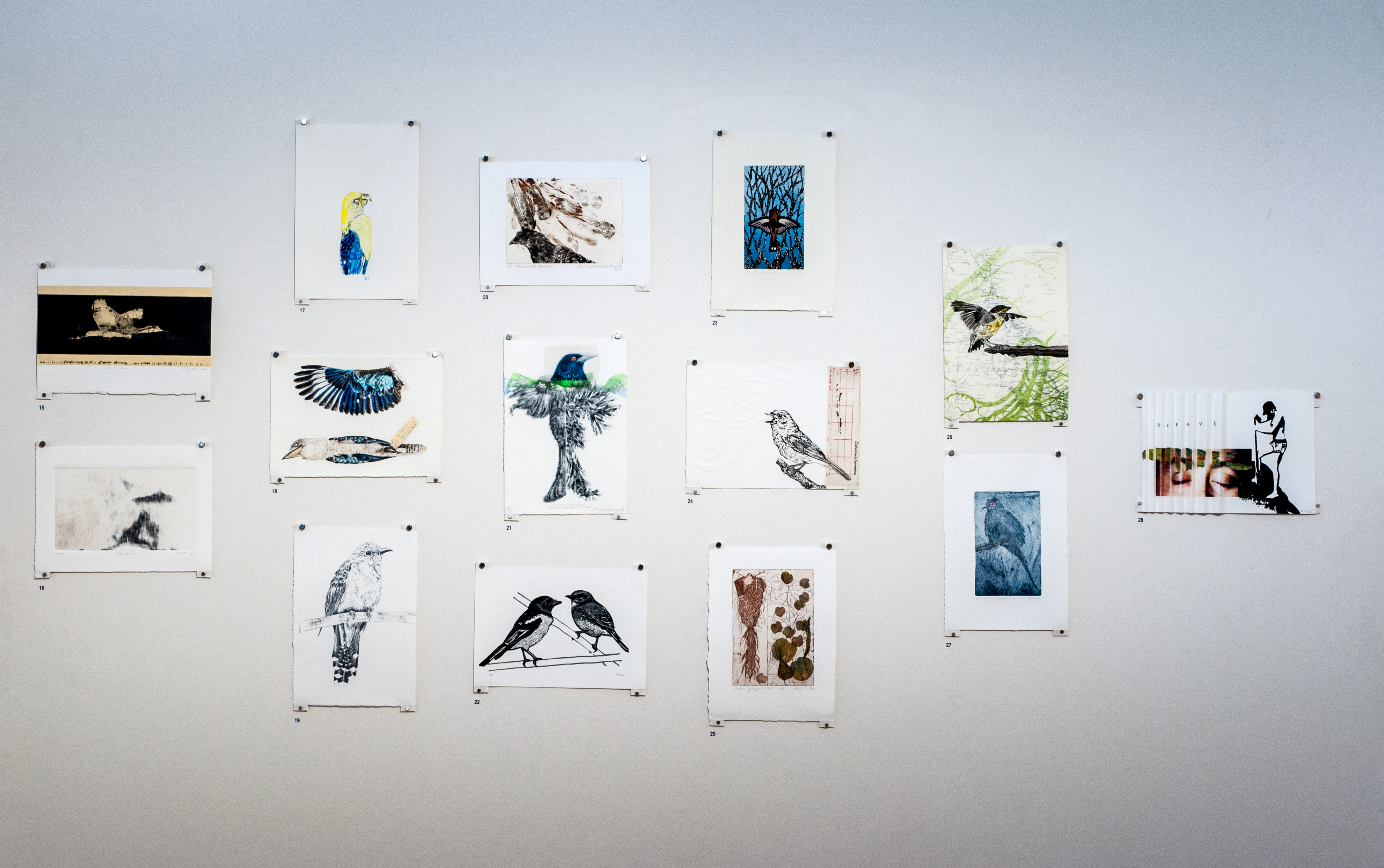 Bimblebox 153 Birds was exhibited at the Impress Printmakers Studio and Gallery, Brisbane in May 2015.  It was astonishing to see so many species of birds filling the gallery.  Audio of the writers poetry & prose mixed with the musicians bird calls played into the gallery.  A listening station provided the opportunity to choose to listen through headphones to any of the audios by the writers and musicians.  Also provided in folders were printed copies of the bird inspired poetry and prose.