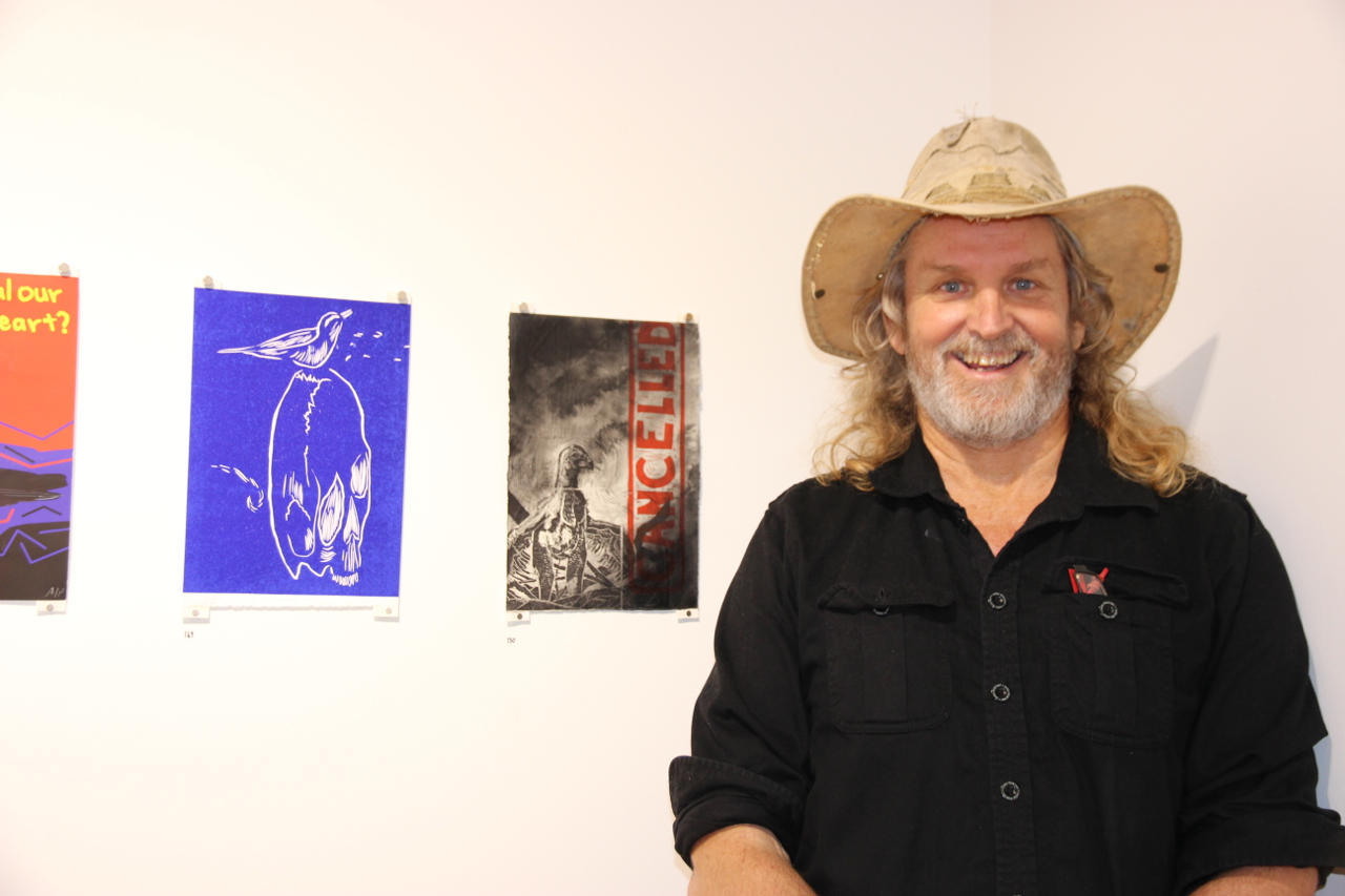 Gerald Soworka wiht his artwork at the opening of Bimblebox 153 birds, photo Jill Sampson.