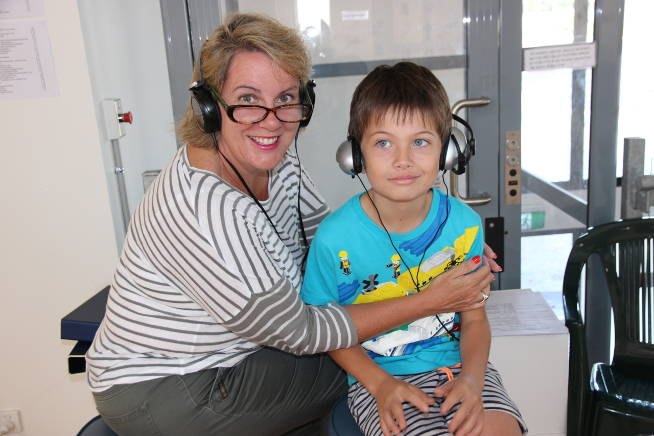Writer Jane Frank shares her poem about the Grey-fronted Honeyeater with her son Euan, photo Jill Sampson