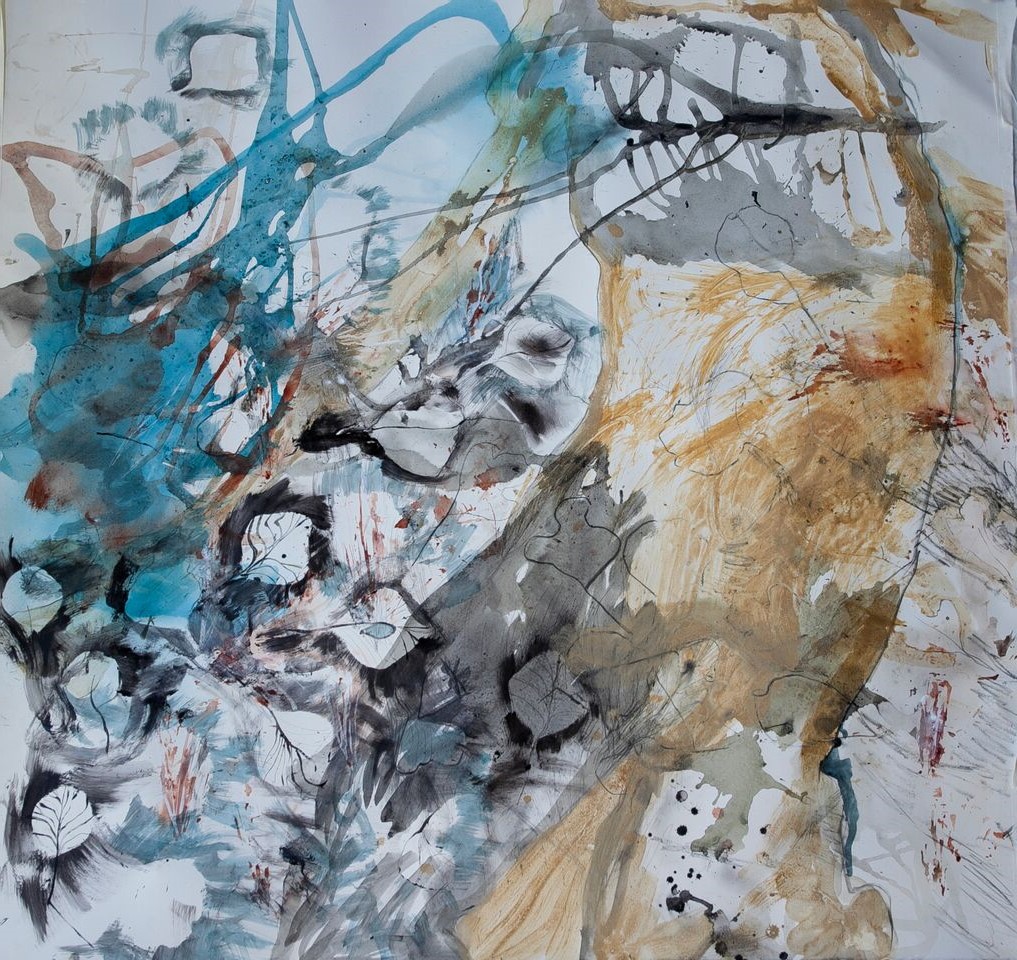 The works created during this sojorn were plein air style, contour drawings and aerial like paintings. I used my own shadows and the moving canopy to create many works. The silhouettes of leaves and figures suggests the inter-connected tangled web of sediment, land and water.