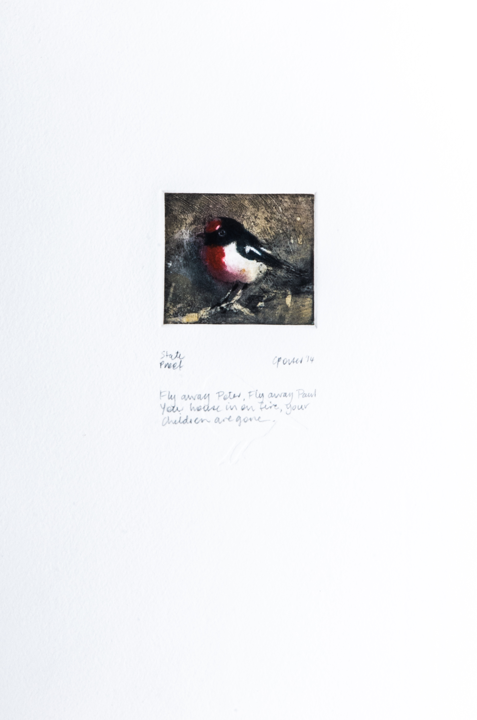 Fly away Peter, fly away Paul, Your house is on fire , your children are gone, 2014, Christine Porter, photo Paula Quintela. Bird species Red-capped Robin, Published August 4, 2018 at 1947 × 2935 in Only a few fundraising days left – Bimblebox 153 Birds ← Previous Next → Fly away Peter, fly away Paul, Your house is on fire , your children are gone, 2014, Christine Porter, photo Paula Quintela Species: Red-capped Robin