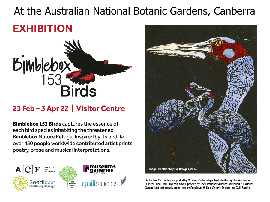 If you are in the Canberra Region, visit Bimblebox 153 Birds at the Australian National Botanic Gardens to experience the birdlife of the Bimblebox Nature Refuge. Writers, Artists and Musicians from around the world have created a multilayered exhibition of poetry, prose, music and artwork.