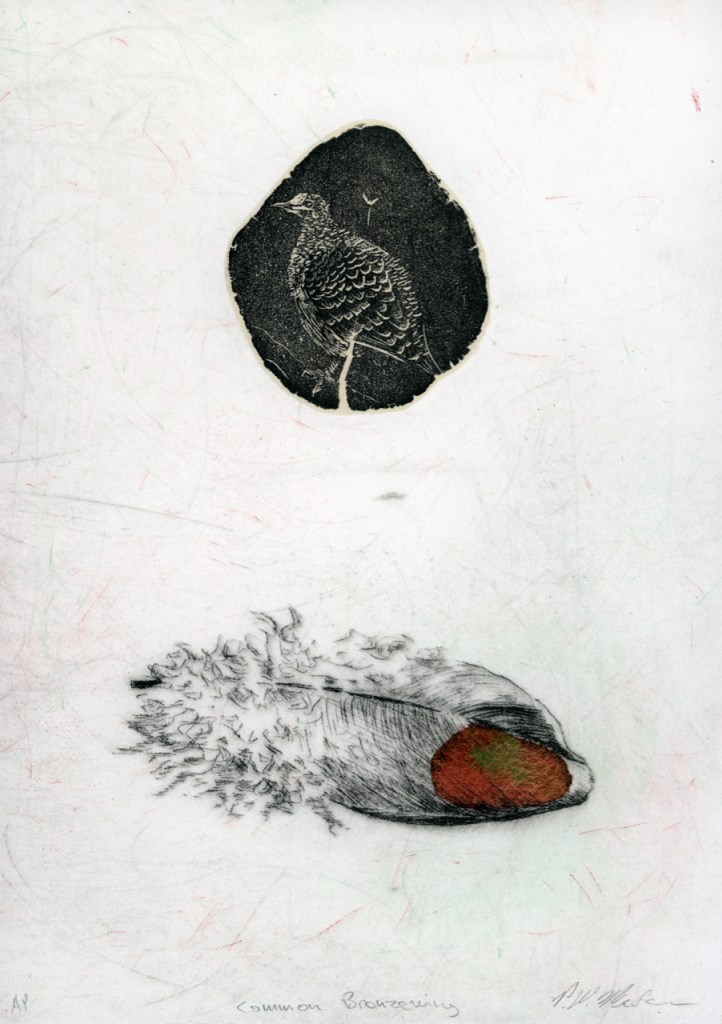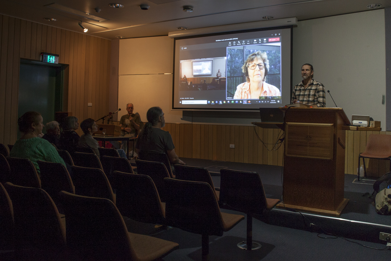 Robin Davidson introduces Jill Sampson (curator of Bimblebox 153 Birds) to speak via internet, photo Dave Wong.Emu, writer Janne Graham The Bimblebox Emu, musician Klue (Gabriel Clouston) on mic stand and processing, audio compilation and mixing by Boyd. Artist Peter McLean talks about his Bimblebox 153 Birds wood engraving and drypoint of the Common Bronzewing, photo Dave Wong.Common Bronzewing, wood engraving and drypoint with copper foil and chine collé, 2014, Peter McLeanBush Stone Curlew, writer Hazel Hall Bush Stone Curlew burhinus grallarius, musician Colin Offord on Wedge-tailed Eagle feather flute, bamboo horn & bamboo windpipe, audio compilation and mixing by Boyd.Musician Nitya Parker weaving music throughout the evening, photo Dave Wong.Pheasant Coucal, writer Sonya Duus Pheasant Coucal on Bimblebox Nature Refuge, musician Roger Dean on piano and electronics, audio compilation and mixing by Boyd.Poet Fiona McIlroy performs her poem Oratorio at Bowen Creek, photo Dave Wong.Speckled Warbler, writer Fiona McIlroy Oratorio at Bowen Creek, musician Reflected Chop on software synths, audio compilation and mixing by Boyd.Musician Nitya Parker, photo Dave Wong.Ausrtalian Pelican, writer Sandra Renew The pelicans fly on, musician Bassling on Balloon, audio compilation and mixing by Boyd.Robin Davidson performing his poem Australian White Ibis, photo Dave Wong.Australian White Ibis, writer Robin Davidson, musician Vincent Dwyer on broken tape deck, audio compilation and mixing by Boyd.After the event audience members were invited to explore the Bimblebox 153 Birds exhibition, photo Dave Wong.