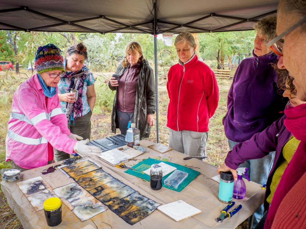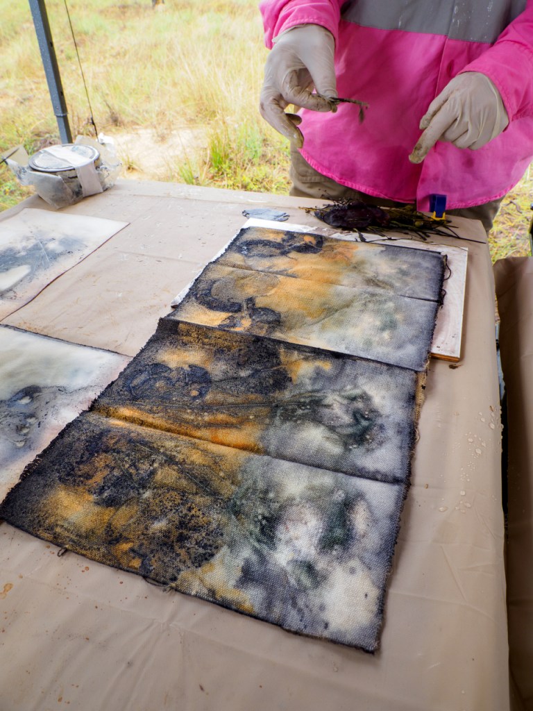 Artwork in the field, L to R: Eco-dyed work by Sally North and Peta Lloyd; Carol Khan cutting lino; Artmaking conversations; Inking the lino block, Emma Scragg inking up a lino plate, with Peta Lloyd; Eco-dyed fabric; Dianne Brown and her lino-block prints; Sally North working with the plants of Bimblebox on paper.