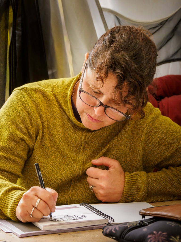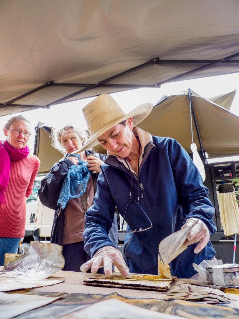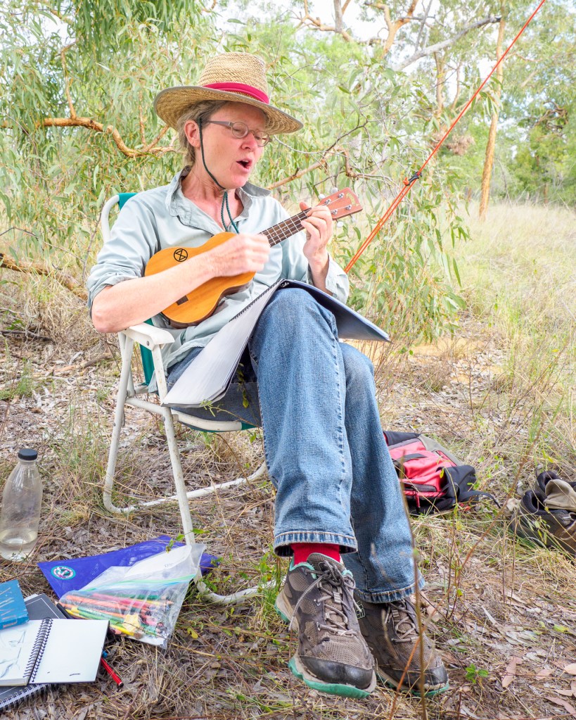 “Artists from around the country, braving the lingering threat of the pandemic raging and of flood waters, were prepared to sleep out on the beautiful land, creating, feasting, singing and stoking our hearts fire with plants, paints, the wildlife, love and inspiration with the very soil and air as muse. From day one people pursued their vision alone, in pairs or groups as they rambled and rode, explored waterholes and heaths, wildlife and wildflowers, and marvelled at trees that wore yellow clothes or dangled their leaves like coins in the wind…” Carol Khan
