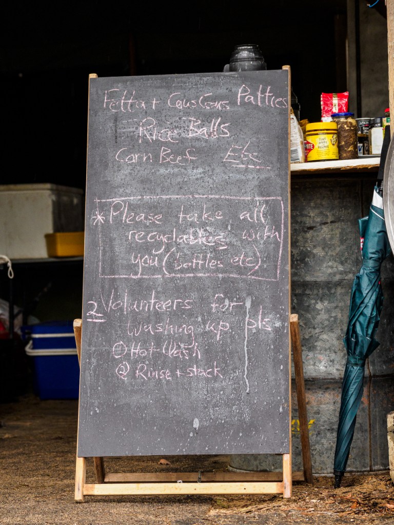 photos above, L – R: Menu and comms board in outdoor kitchen; Jesse and Carol preparing food for the delicious meals; Outdoor cooking, Bimblebox camp style; Kettle on the outdoor slow combustion stove.