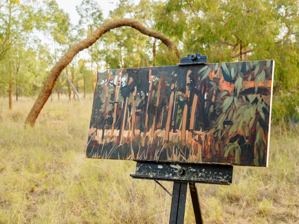 “I squeeze the paints from their tubes and sketch the branches of the ’yellow jacket’ eucalypts onto my canvas. I am in ‘the zone’ and work quickly. I listen to the murmur of wind in the treetops and try to recognise different bird calls. These are the sounds and the colours the first people of this land have known for thousands of years.” Frida Forsberg