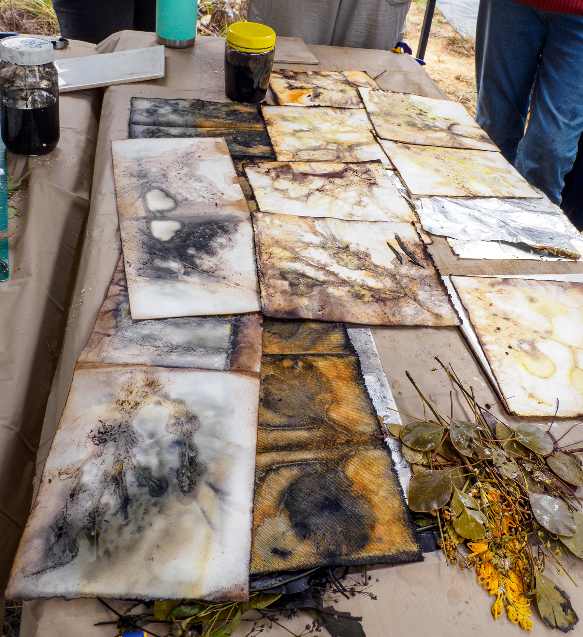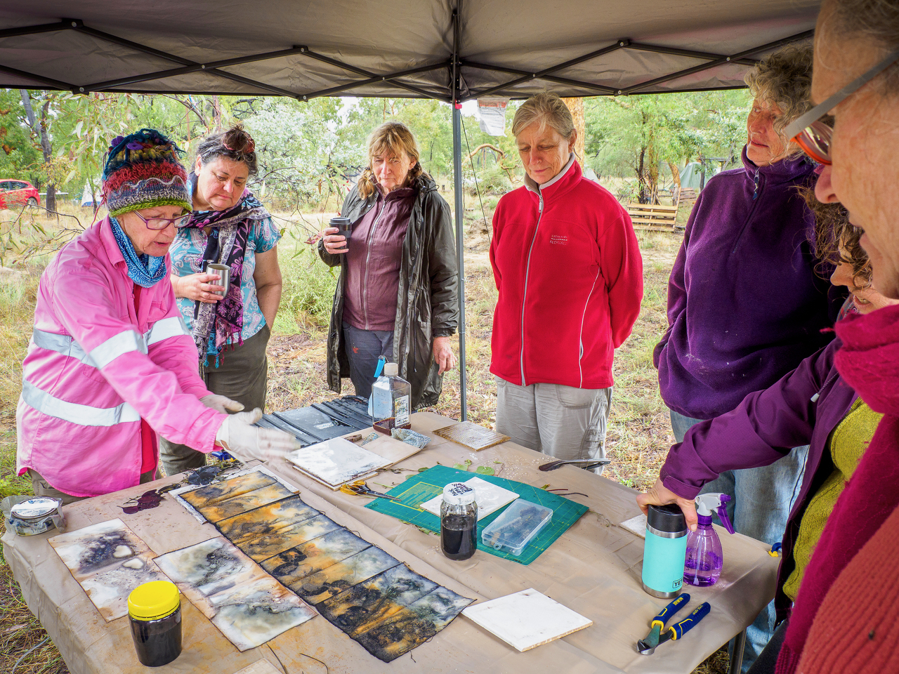 Artwork in the field, L to R: Eco-dyed work by Sally North and Peta Lloyd; Carol Khan cutting lino; Artmaking conversations; Inking the lino block, Emma Scragg inking up a lino plate, with Peta Lloyd; Eco-dyed fabric; Dianne Brown and her lino-block prints; Sally North working with the plants of Bimblebox on paper.