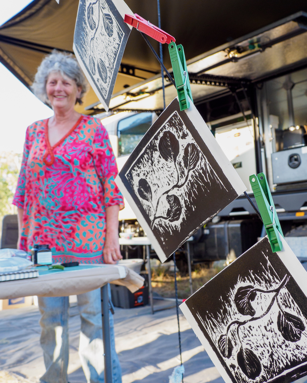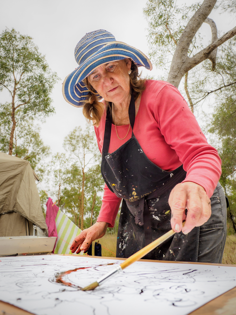 “Artists from around the country, braving the lingering threat of the pandemic raging and of flood waters, were prepared to sleep out on the beautiful land, creating, feasting, singing and stoking our hearts fire with plants, paints, the wildlife, love and inspiration with the very soil and air as muse. From day one people pursued their vision alone, in pairs or groups as they rambled and rode, explored waterholes and heaths, wildlife and wildflowers, and marvelled at trees that wore yellow clothes or dangled their leaves like coins in the wind…” Carol Khan