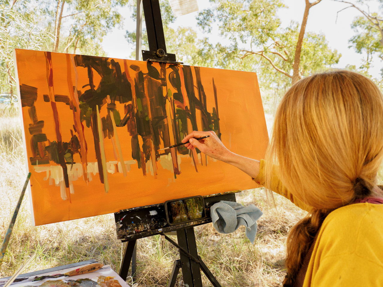 “I squeeze the paints from their tubes and sketch the branches of the ’yellow jacket’ eucalypts onto my canvas. I am in ‘the zone’ and work quickly. I listen to the murmur of wind in the treetops and try to recognise different bird calls. These are the sounds and the colours the first people of this land have known for thousands of years.” Frida Forsberg