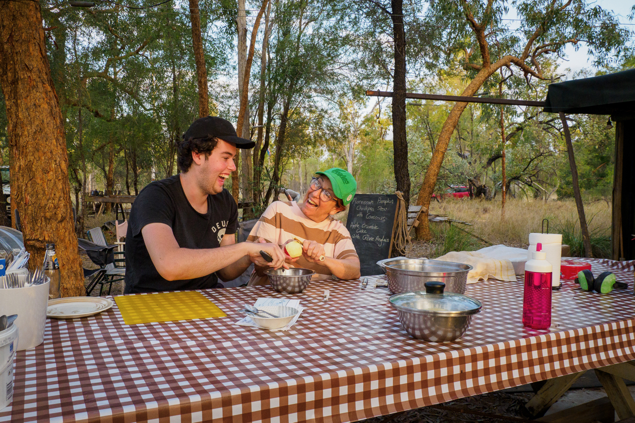 photos above, L – R: Menu and comms board in outdoor kitchen; Jesse and Carol preparing food for the delicious meals; Outdoor cooking, Bimblebox camp style; Kettle on the outdoor slow combustion stove.